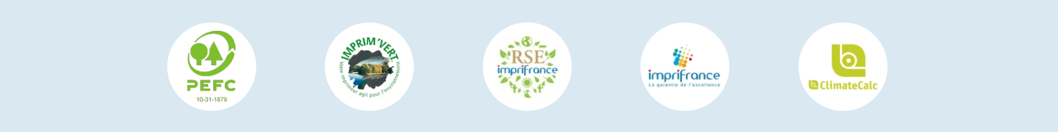 Certifié PEFC, Imprim’Vert, ClimateCalc et RSE IMPRIFRANCE, nous mettons en œuvre l’ensemble des mesures nécessaires au maintien de ces labels sur notre site de production de 4 000 m² d’ateliers, garantissant des pratiques responsables à chaque étape de la chaîne graphique.